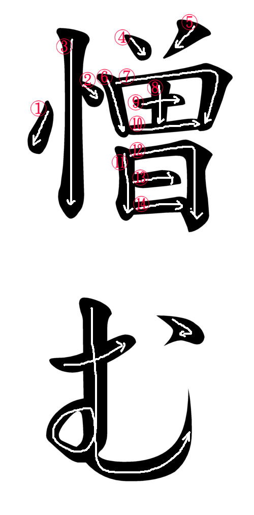 The left side Japanese word “憎む(にくむ-nikumu)” means “Hate”.